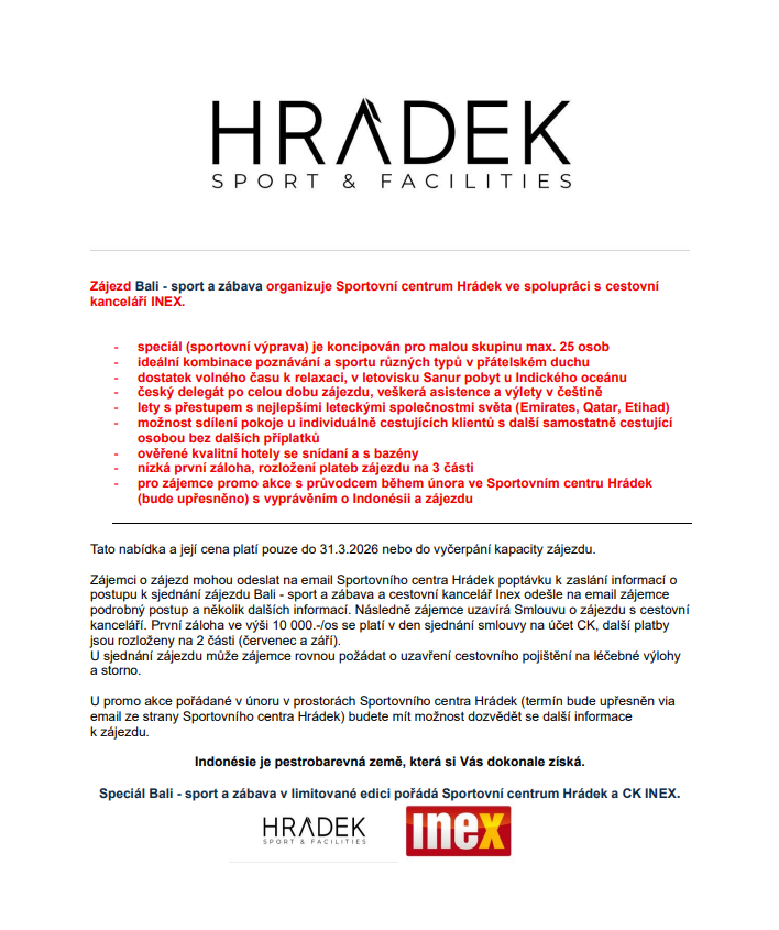 Sportovní centrum Hrádek ve spolupráci s CK INEX pořádá na podzim 2026 super sportovní zájezd na Bali.